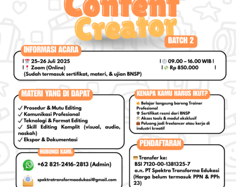 🔥 Siap Jadi Content Creator Profesional?Yuk #NaikLevel bareng PT Spektra Transforma Edukasi! 📅 25-26 Juli 2025🕘 09.00 – 16.00 WIB💻 Via Zo...