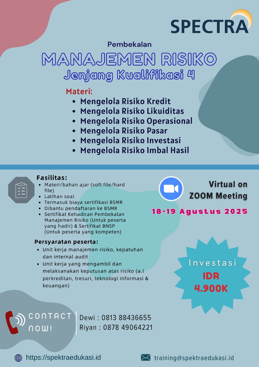 #ManajemenRisiko #PelatihanBNSP #BSMR #TrainingOnline #SertifikasiProfesional #SpektraEdukasi #RiskManagement #Kualifikasi4